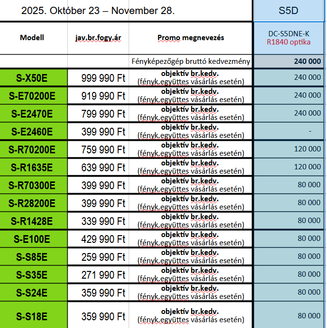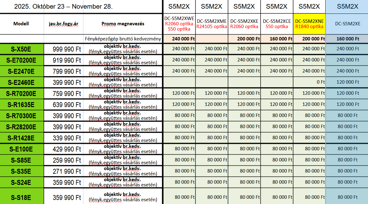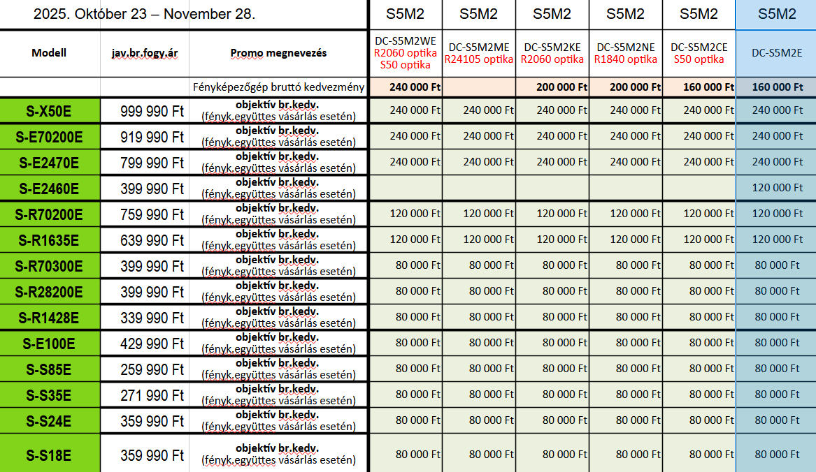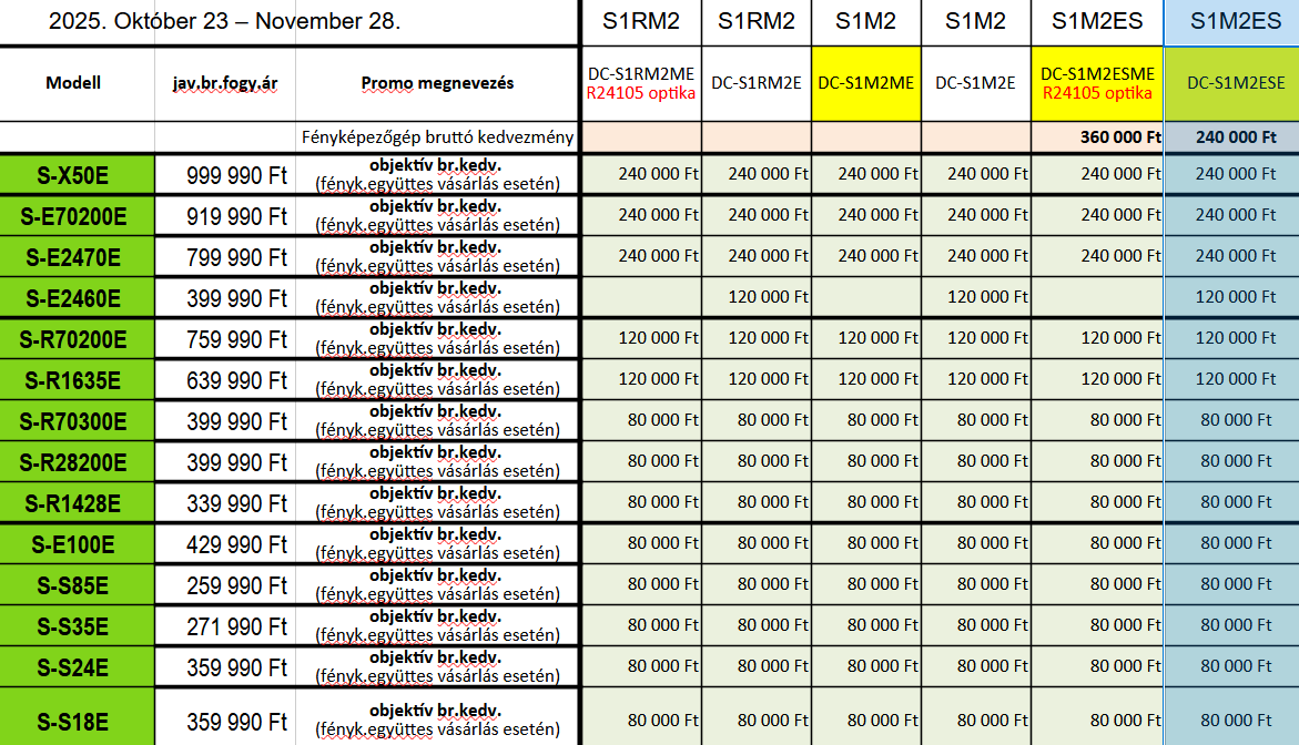 A lenti táblázatban feltüntetett Panasonic LUMIX FullFrame fényképezőgép és optika együttes vásárlásakor 2025. Október 23 és November 28 között az alábbi bruttó kedvezményeket kapja: